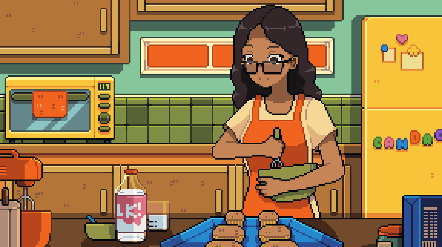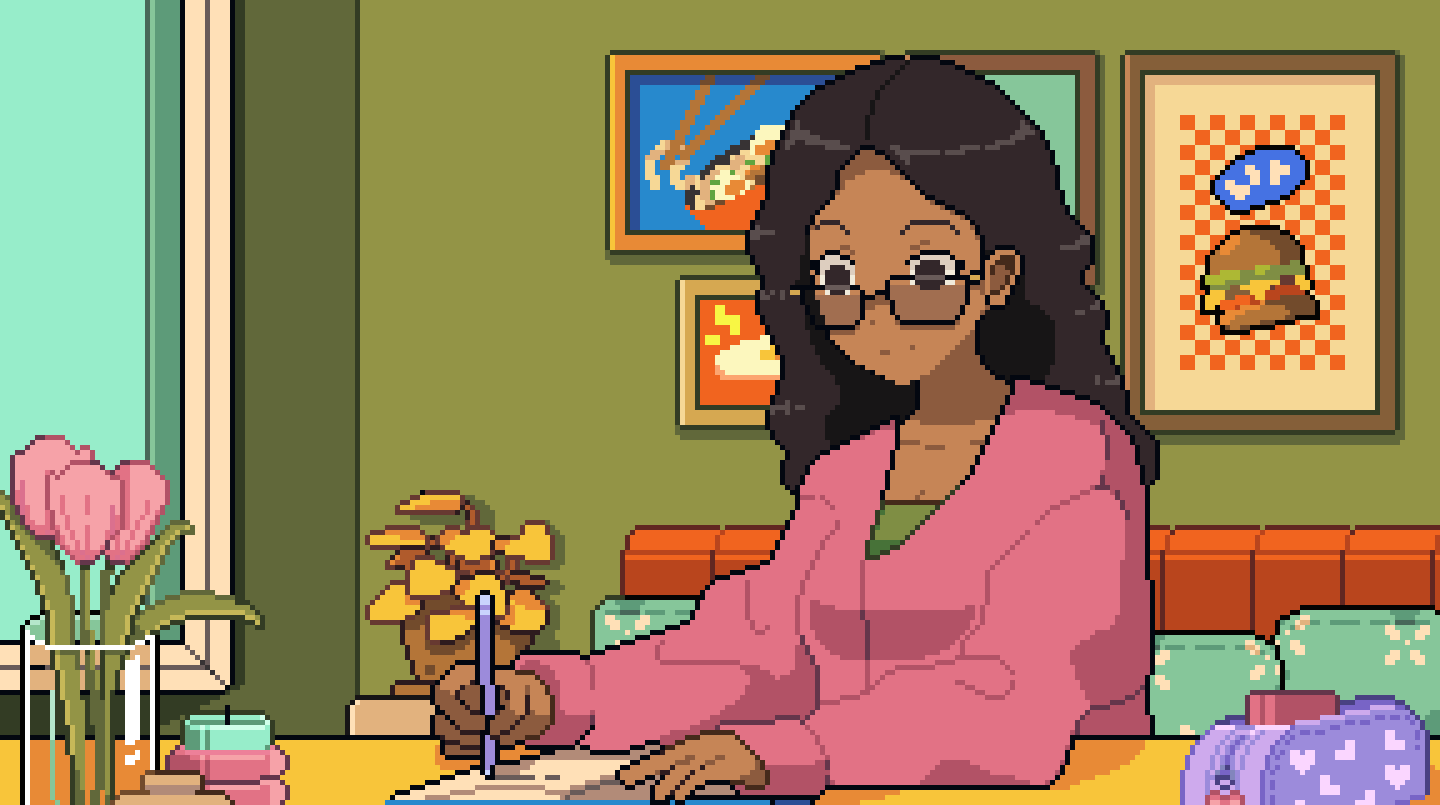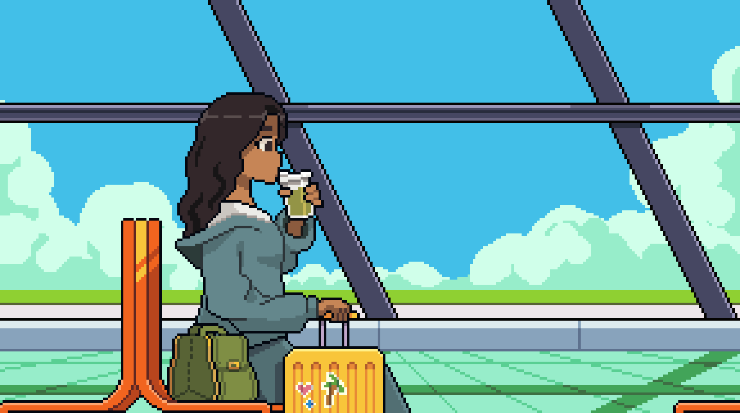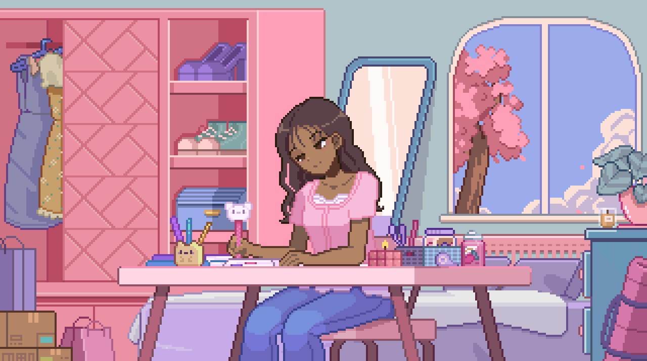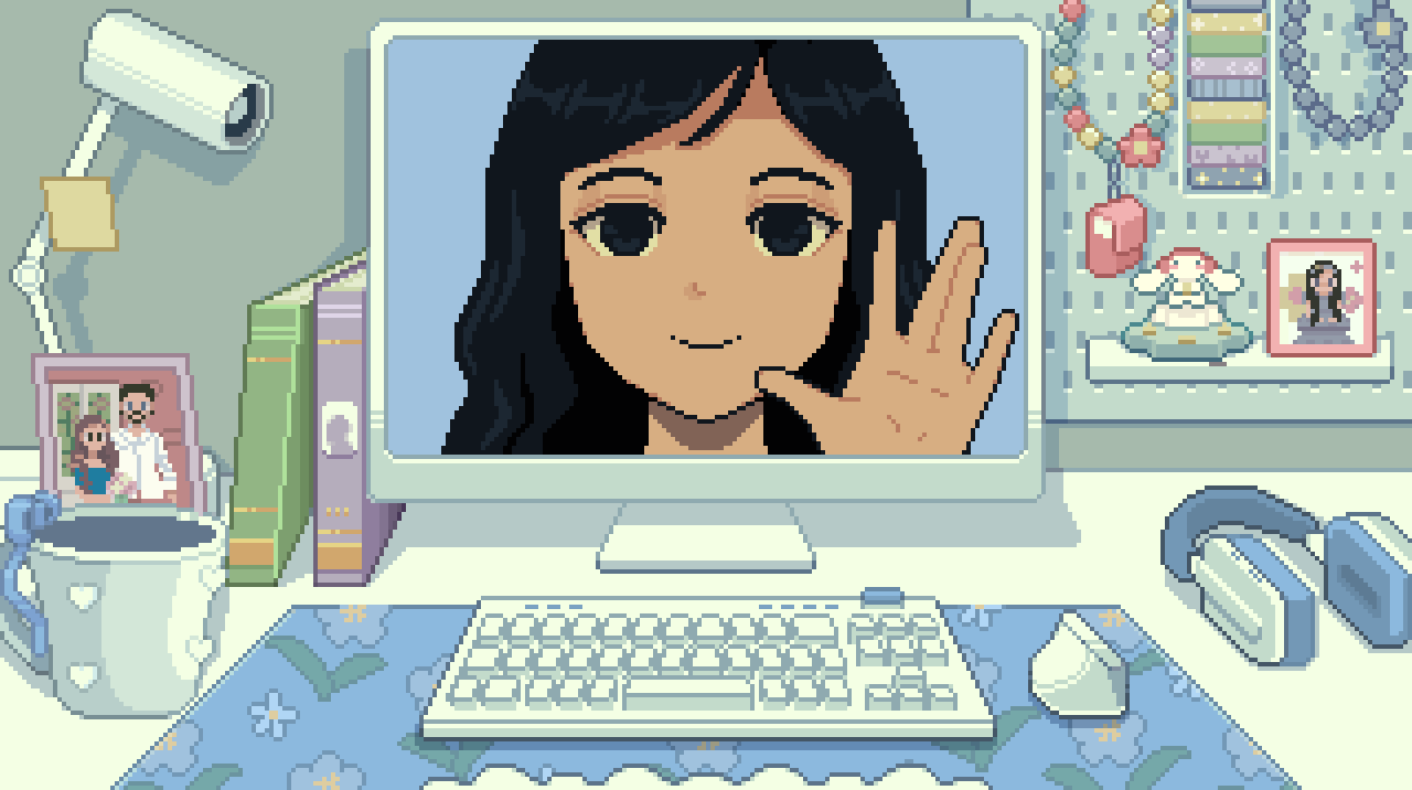 Animated hips - up portrait of your character with detailed background and minimal animated background elements.